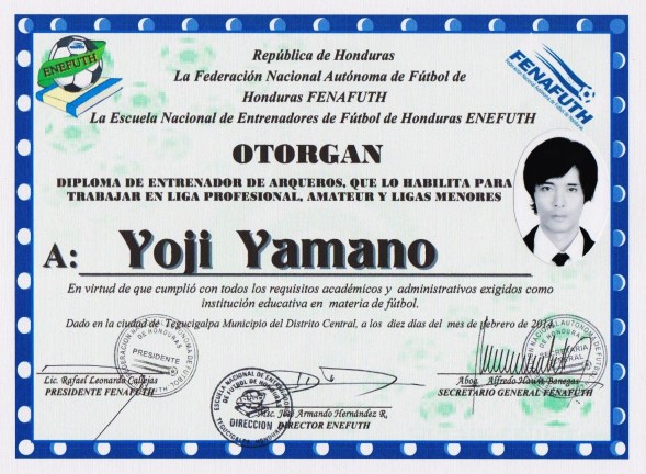 2014年。 ホンジュラスサッカー協会公認GKコーチライセンス取得(日本人初)