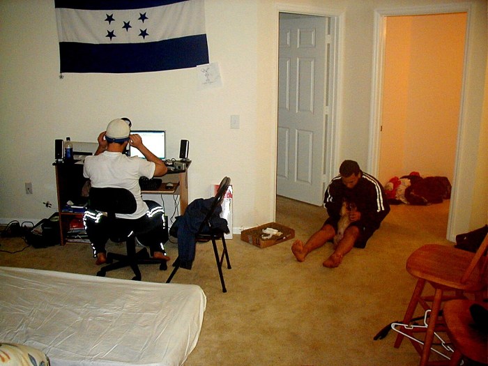 ルームメイトが僕達の部屋で犬を飼っていました。僕たちのアパートは2つの部屋が有り、1つをその犬の飼い主が1人で使い、もう1つのキッチンなどが有るみんなの部屋を、僕ともう1人の2人で共用してました。
