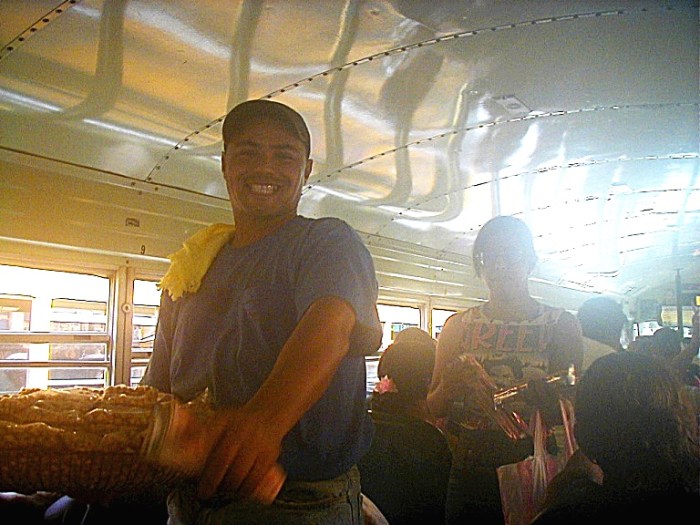 ※バスの中でピーナッツを売るおじさんです!見て下さい、この『笑顔』を!!そして、ピーナッツを入れてるかごのような物は、実は『扇風機の網』です。