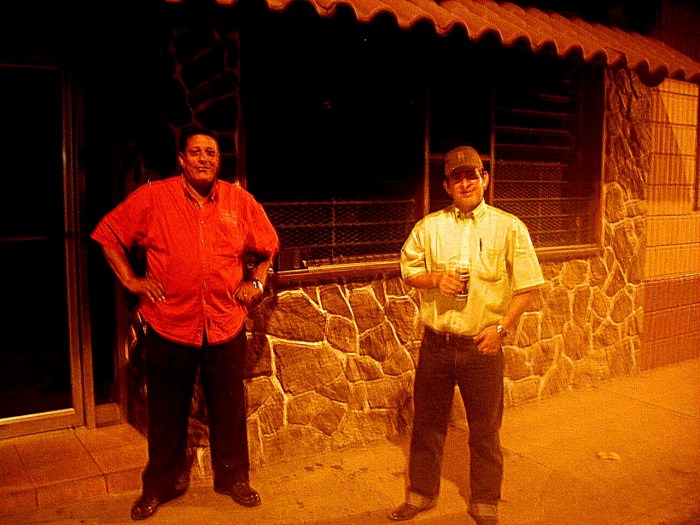 ※夜のホテル前。警備のおじさんと、どこかのおじさんが、ビールを片手に語り合ってます。危険区域のはずなのですが、彼らの笑顔を見てると、「本当に危険区域なの??」とも思えてきます…が、危険なので、夜は、部屋に閉じこもってました。