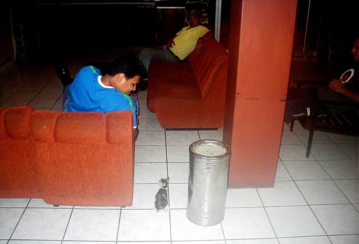 ※子猫の存在に気付く、ホテルのおじさん。個人的には、部屋の天井で、毎晩、「これは犬か!?」と思わせるほど大きな足音でネズミが走るので、この子猫を自分の天井裏に置きたいくらいでした。