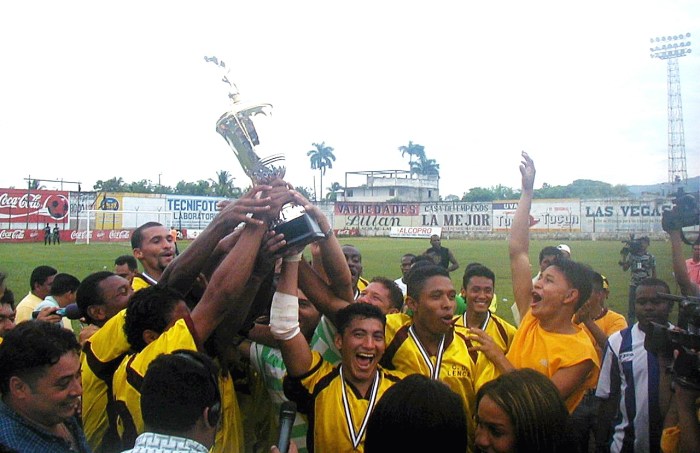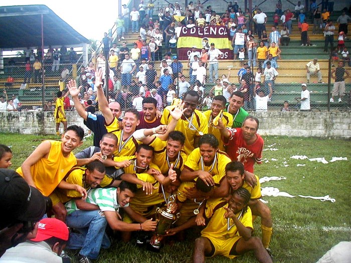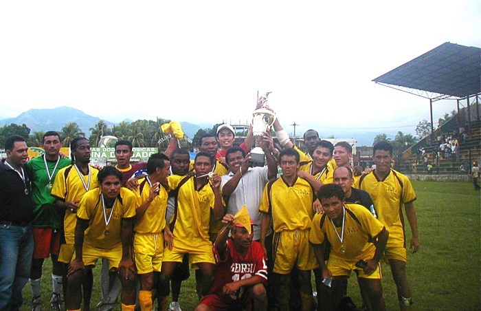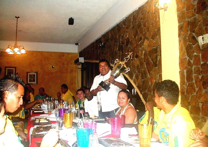 ※優勝記念写真!!…てか、前列の真ん中に座ってる赤いTシャツ着たおっちゃんとか、全然、関係ない一般人なんですけど…。他にも何人か全く関係ない人が、どさくさに紛れて写真に写ってる…。さすが、「ありえない」があるホンジュラスです。