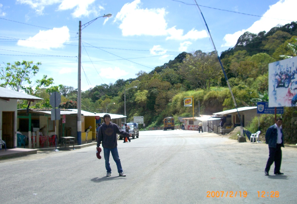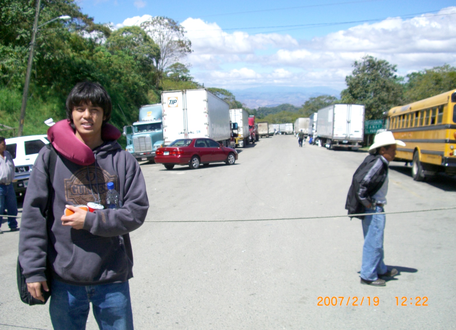※僕の後ろに見える「線」が、ホンジュラスとニカラグアの「国境線」です!!!「線」より向こう(トラックが並んでる方)が、ホンジュラスです。…ちなみに、「『ジャマイカ行き』の時と、同じ服装じゃないか!」というツッコミは無しにして下さい(笑)。もともと日本からこっちに服は持ってきておらず、このパーカーは、「ジャマイカ行き」の前、なぜか寒かったので、急遽、ホンジュラスで購入したものです。このパーカーが、現在、僕が持っている「唯一」の、「寒さ対策」の服なのです(涙)。