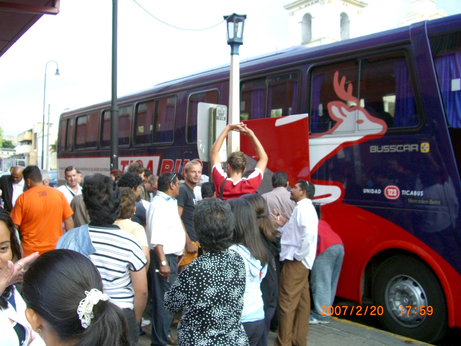※やっとコスタリカの首都「サン・ホセ」に到着して、みんな一安心…。真ん中に見える欧米人(手を上げている人と、その隣の、こちらを向いている人)は、ポーランドからの旅行者です。