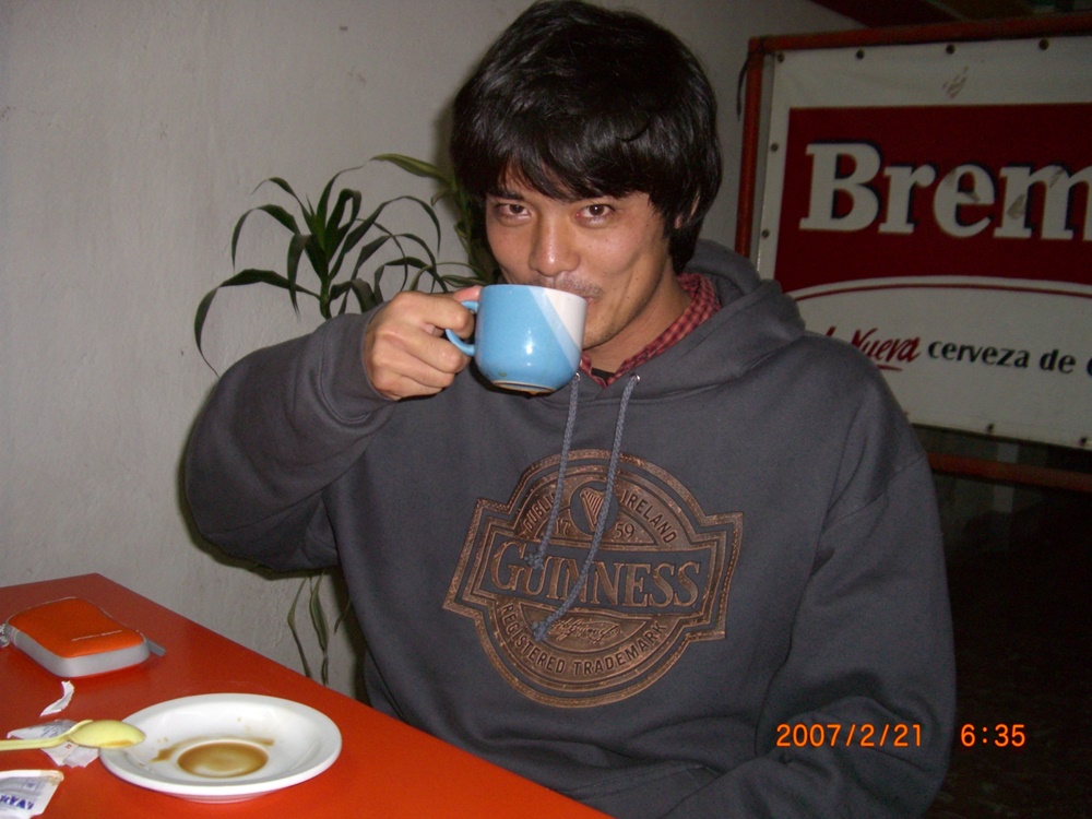 ※とりあえず、冷えに冷え切った体を、「中米コーヒー」で温めます。…至福の瞬間!!!!目の下のクマと、充血した目、ボーボーの寝癖が、「凍て付くバス」の中での死闘を如実に物語っています…。