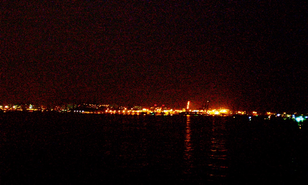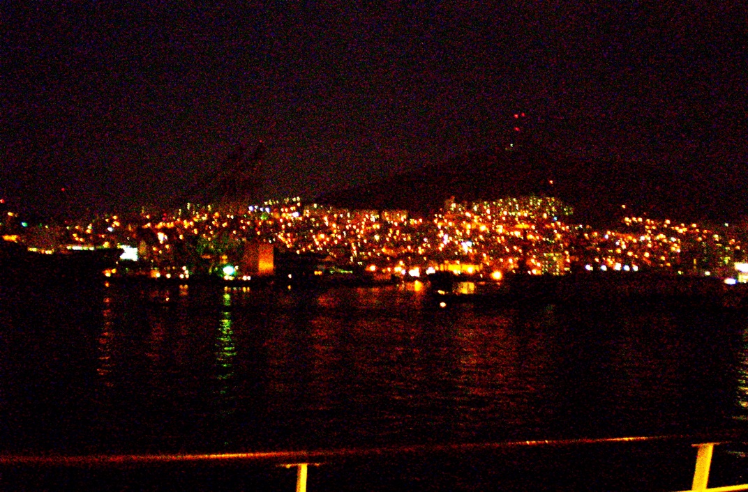 ※帰国の船、出発…。離れ行く、夜の釜山の街…。
