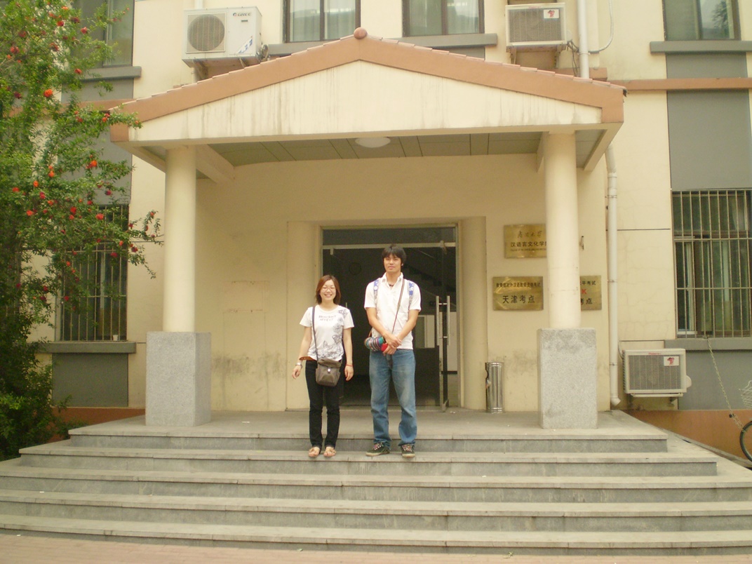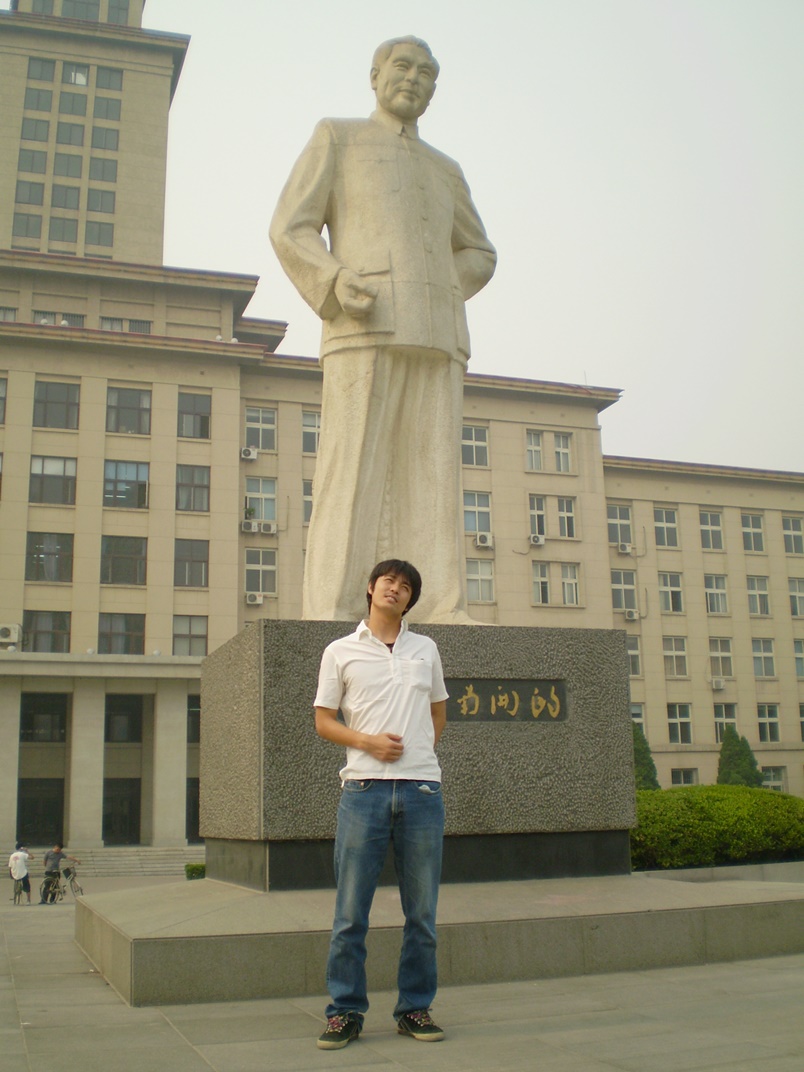 ※これは昔の写真!4年前……2003年。『南開大学』の「漢語言文化学院」前で、クラスメイトと記念撮影。ここで、愉快な先生、クラスメイトと共に、中国語を学びました!!