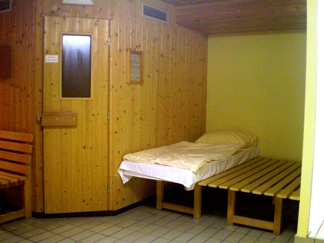 ※ようやく辿り着いた「ユース・ホテル」は、あいにく、全部屋満室…。ピンチ!!しかし、交渉の結果、「サウナ・ルーム」にベッドを特設して泊まらせてもらうことになりました。ラッキー!!