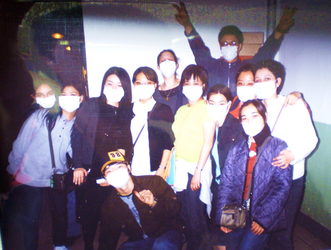 ※2003年「SARS」。天津にて留学生仲間達と。この後、写真の留学生仲間達は全員緊急帰国しました(僕以外)。結局、最後まで残った日本人語学進修生は、僕だけでした(涙)。そして「SARS」が猛威を振るったこの学期、ただの1度も授業を休まず「皆勤賞」を達成した語学進修生も、(多分)僕だけでした(涙)。それなのに、期末テスト後の成績表を見ると「欠席3日」となっていました(涙)。これには猛抗議して、その後、晴れて「皆勤賞」となりました!!(涙涙)