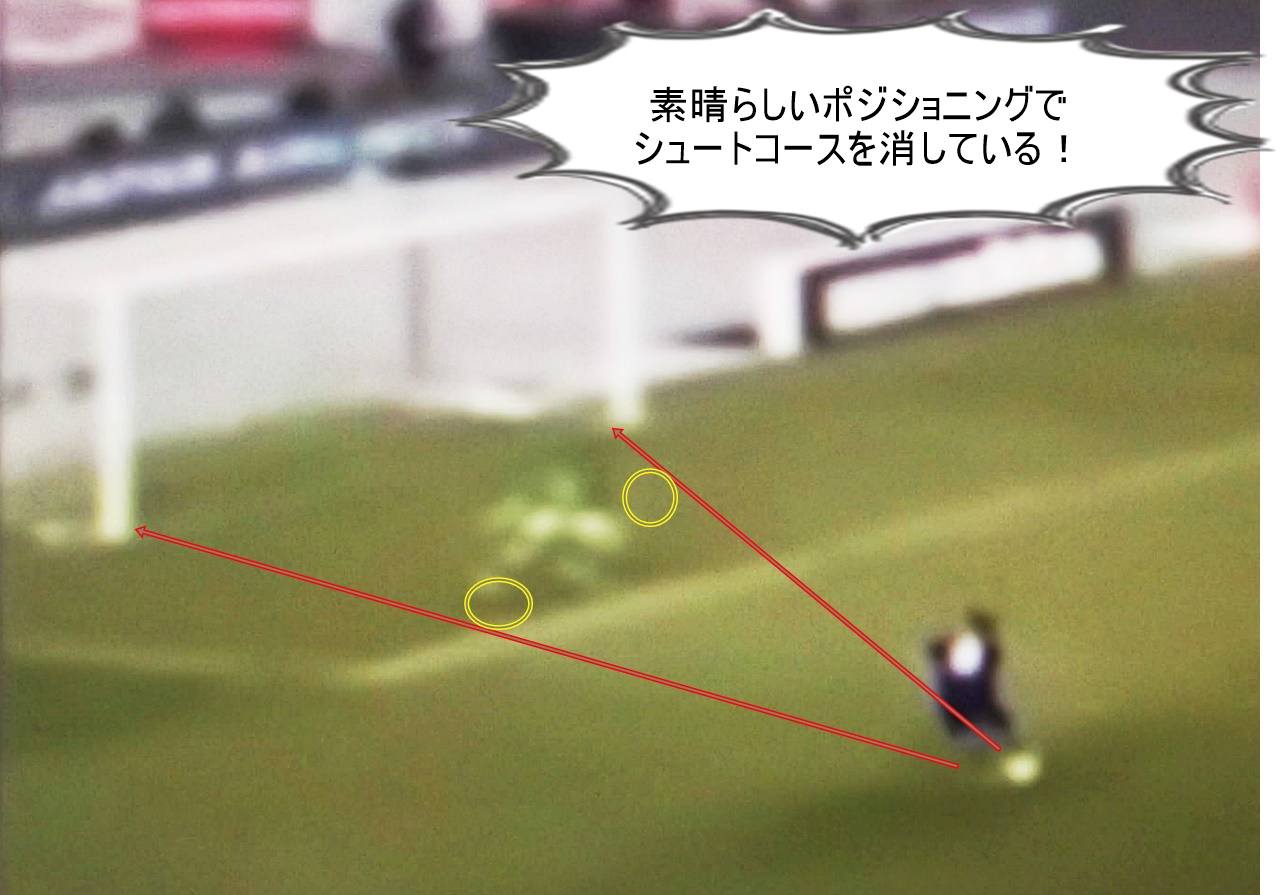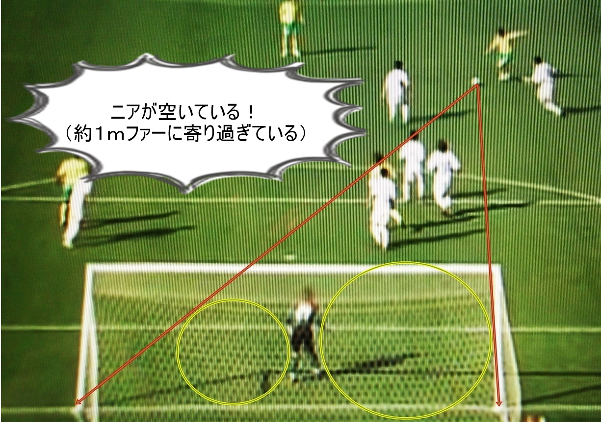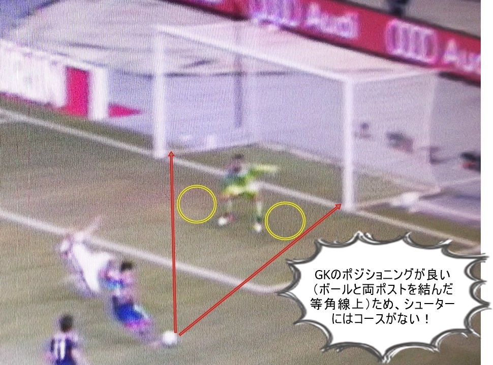 ポジショニングに関しては以前こちらのブログ『【GKプレー分析】スーパーゴールは、スーパーゴールじゃなかった!?誰も触れなかったGKのミス』(☜クリック!)でも書きましたが、間違えると、以下のような失点が起こってしまいます。