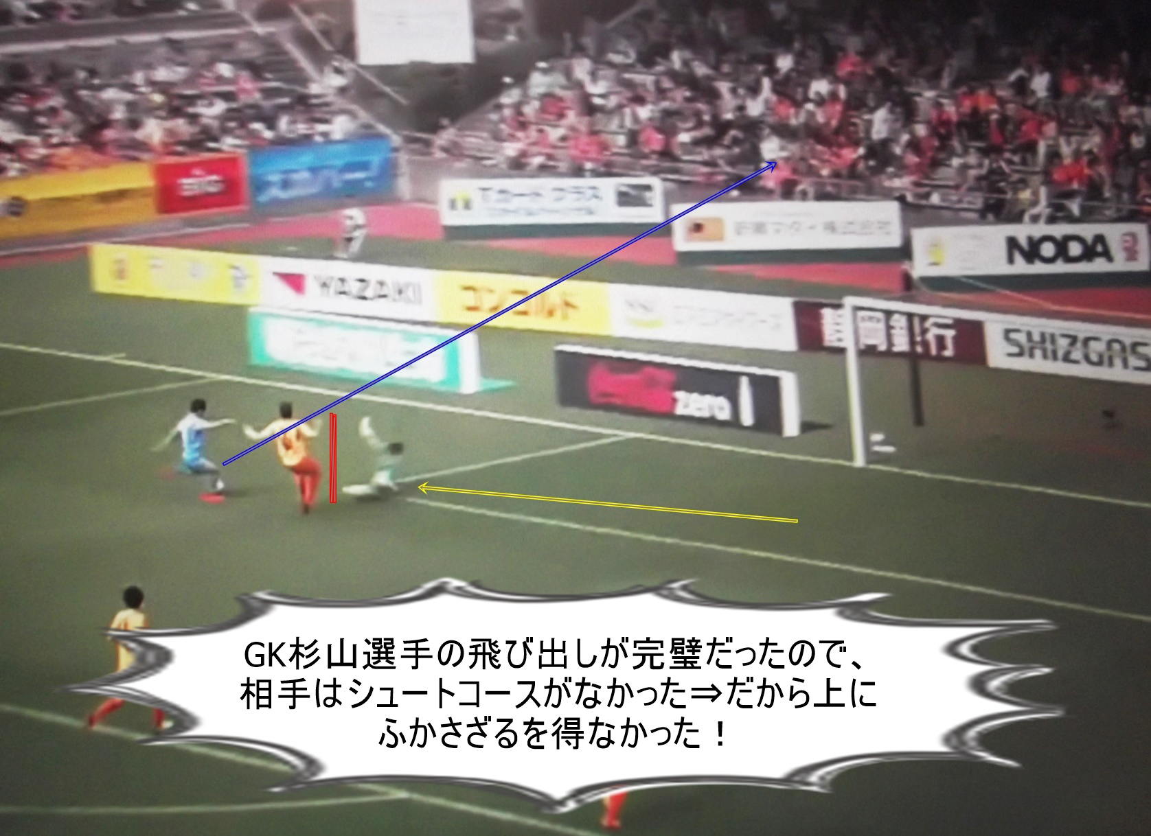 同様のファインプレーは清水GK杉山選手にも見られました。こちらは相手のトラップが上の徳島の選手のトラップよりも良かったためほとんど隙はなく、GKにとっては「飛び出す」判断が非常に難しいプレーでしたが、GK杉山選手が全く躊躇せず覚悟をもって素晴らしいタイミングとスピードで飛び出したため相手にシュートを「外させる」事に成功しました。GK杉山選手の正にファインプレーでした(下の動画「1:42」)。GK杉山選手はずっと五輪代表GK櫛引選手の控えでしたが、苦しい状況にも腐る事なく常に万全の準備をしてチャンスを待ち、ひとたびチャンスがくるとそれまで積み重ねてきた事を試合で遺憾なく発揮して安定したプレーでチームに貢献。がっちりスタメンの座をキープしています。今、サブで試合に出れないで悩んでいるGKは、きっとGK杉山選手からたくさんの事を学べるはずです。