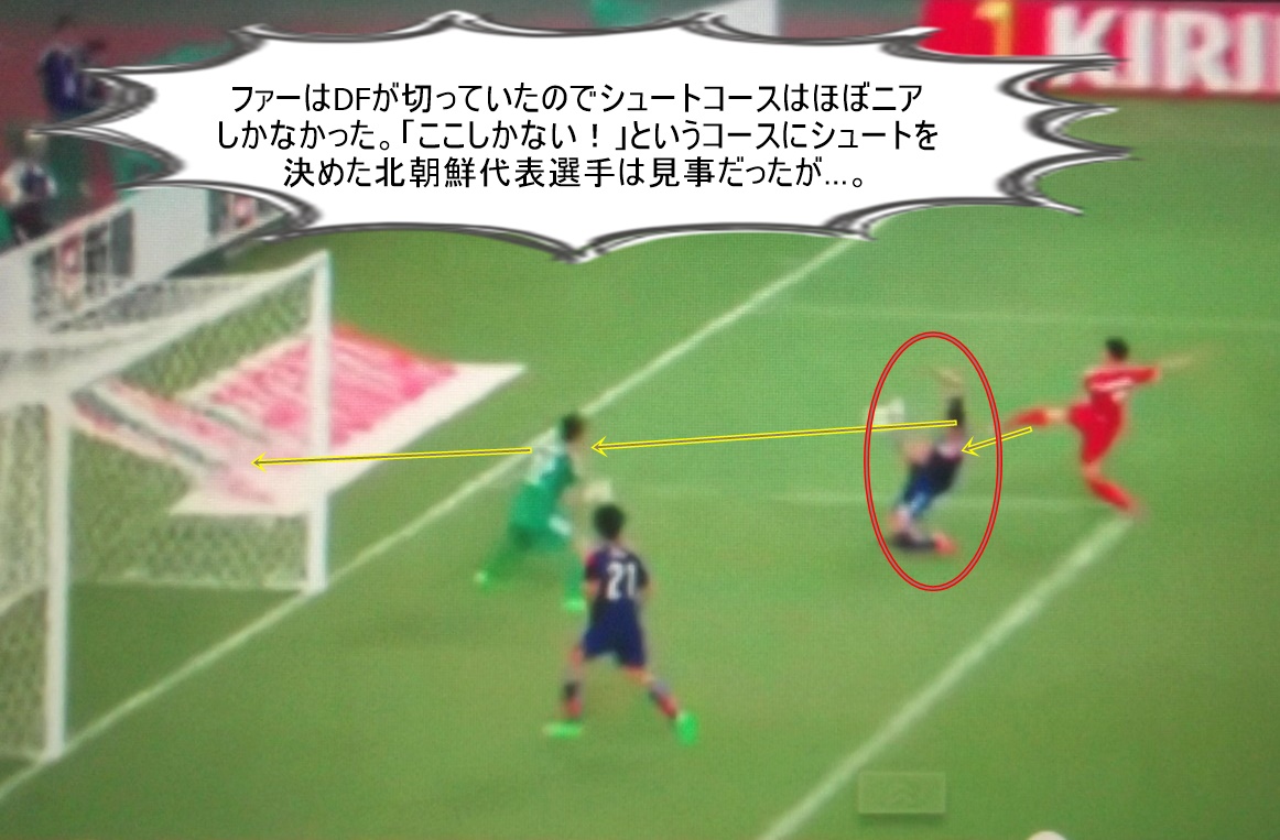この日、北朝鮮は何度もクロスを放り込んできました。それに対して西川選手は、自分が決して「ハイボールが強くない」事を自分自身でよく分かっているので、無理に飛び出さずシュートに備えていました。僕はこの【判断】自体は正しかったと思います。「ハイボールが強くない」のに無理して飛び出せば、それはミスが起こって失点する確率がより高まってしまう事を意味する。もちろん、よりハイボールの強さがあり守備範囲を広く守れれば理想ですが、理想と現実にしっかりと折り合いを付け、現時点での自分の能力をきちんと把握した上で正しい【判断】を下した西川選手は、さすがでした。