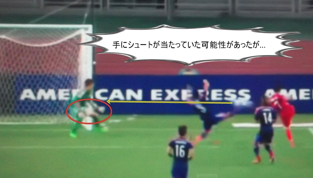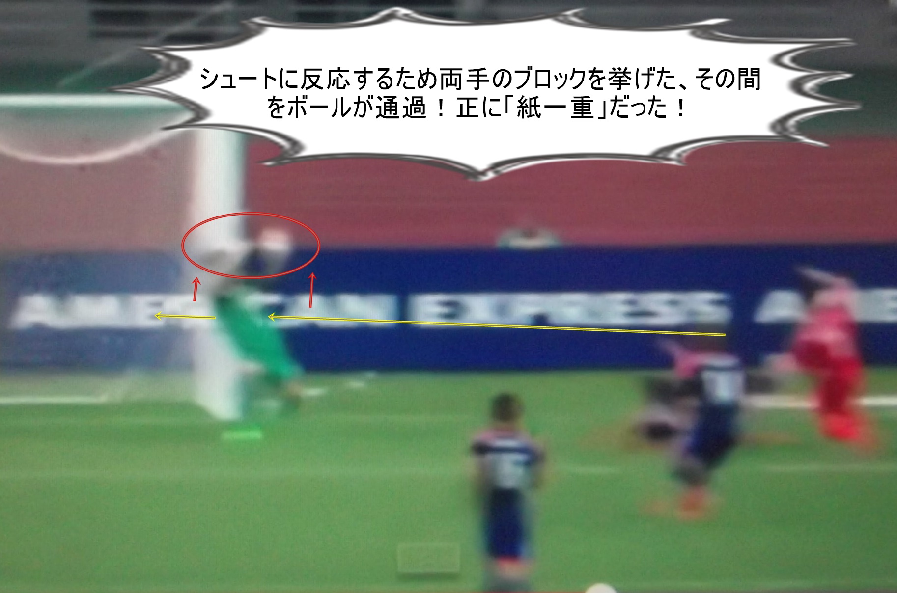 シュートがくる前に最初に構えていた時の「手の位置」ならボールに触れていたかもしれない、反応して手を動かした(手を挙げた)事で空いた脇下をボールが通過してしまった…という面もあるのですが、ここは非常に難しいところです。僕はそこもなかなか責める気にはなれません。