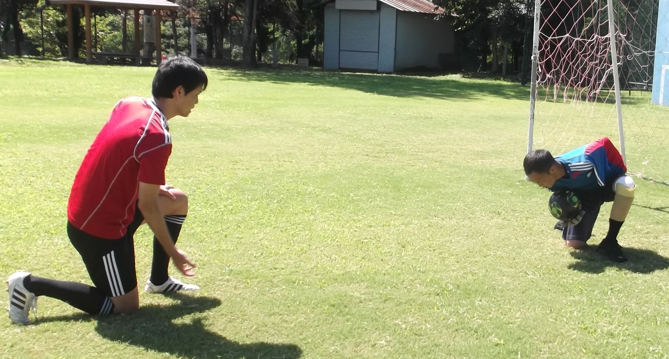 しかし、アンプティサッカーのゴールは「小さい」。例え「腕がある」方向を空けても、しっかりそちら側へのセービングと反応を徹底して鍛えて強化すれば「充分にシュートには届く」という計算です。それよりも、より防ぐのが難しい「腕がない」方向のスペースをポジショニングを寄せて消した方が、失点する確率は低くなる…と考えたのです。