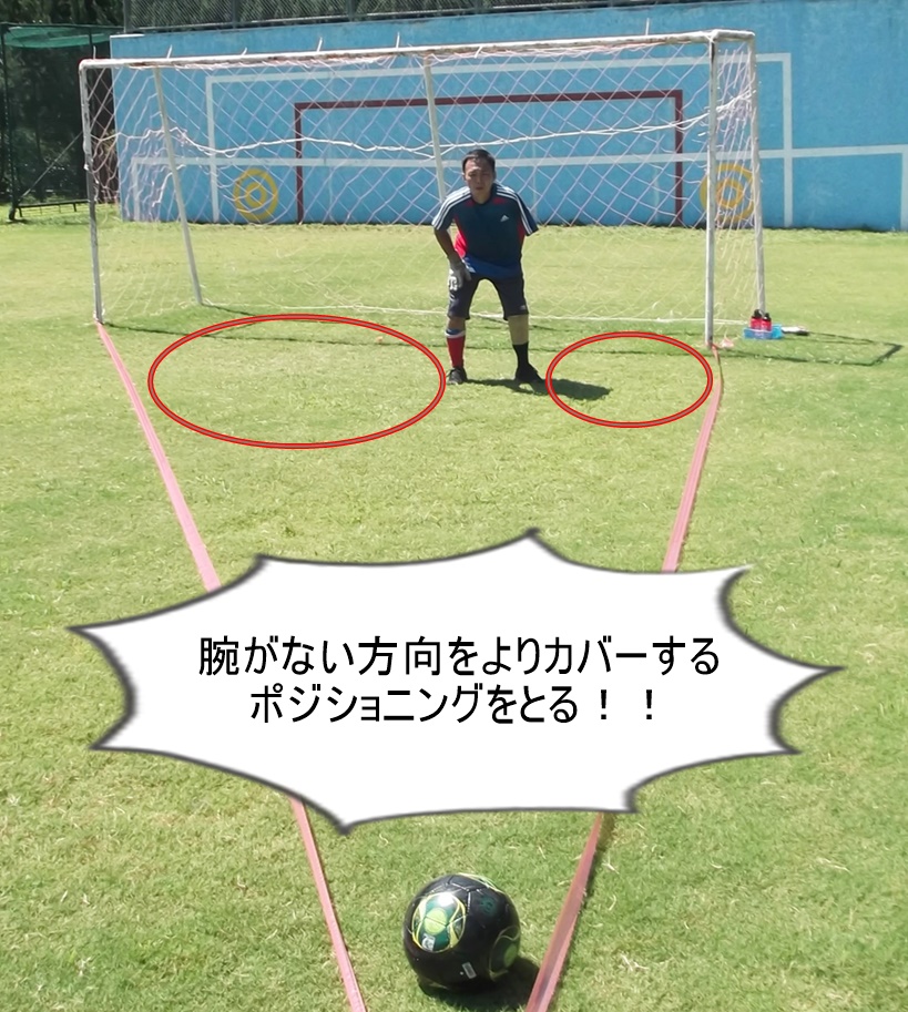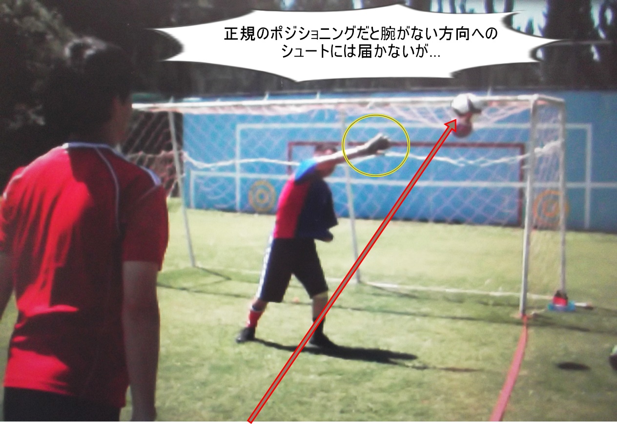 ポジショニングには「ボールと両ゴールポストを結んだ等角線上(かつループを決められない位置)に立つ」という鉄則がありますが、片腕がないGKの場合、「腕がある」方向と「腕がない」方向とでは守備範囲が異なるため(「腕がない」方向の方が守備範囲が狭くなり、届かないシュートが増える)、通常の「ポジショニングの鉄則」とは違う、「『腕がない』方向をよりカバーする、やや『腕がない』方向寄りに立つポジショニング」を考え、練習しました。