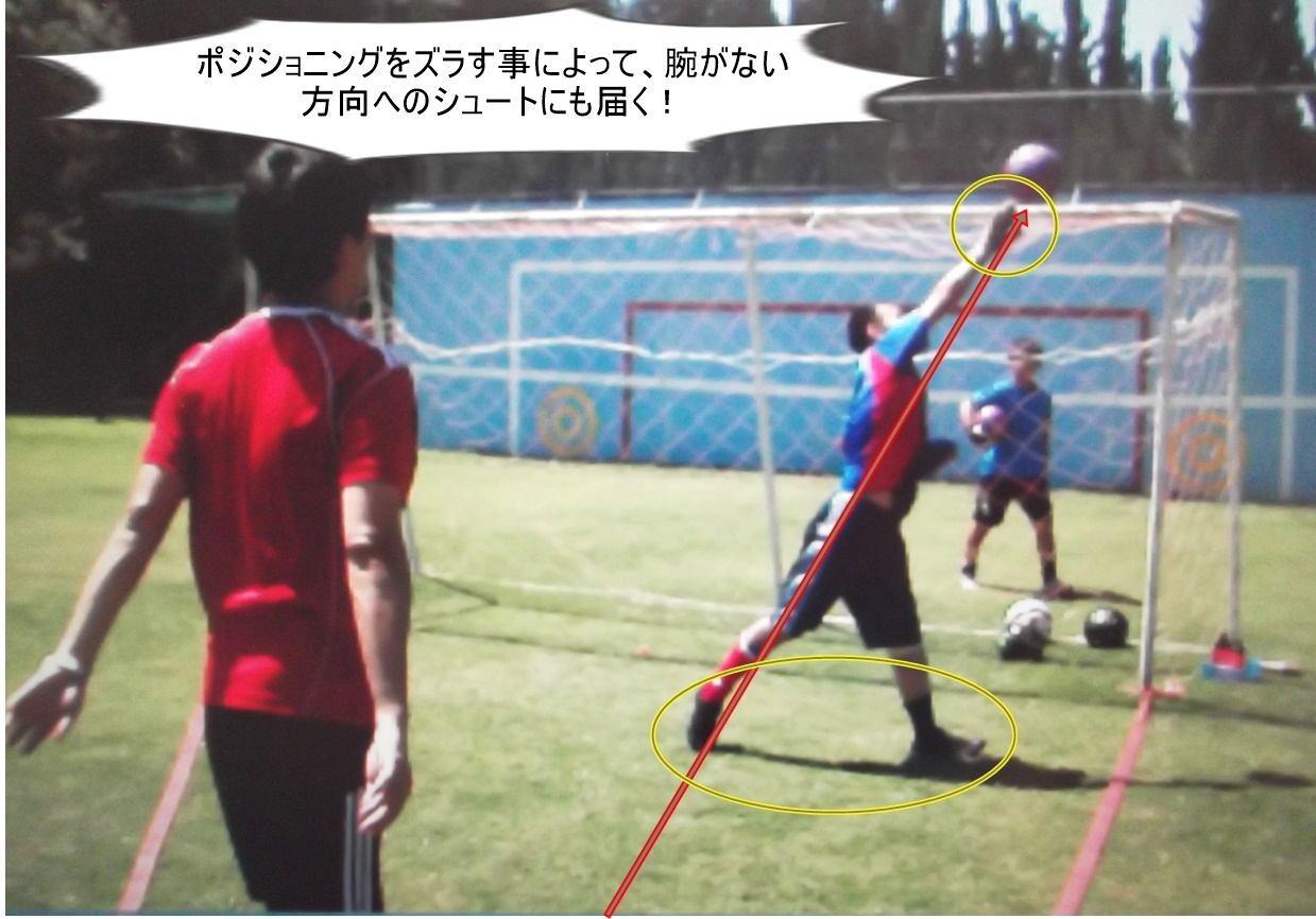 このように片腕でもシュートの強度によってはゴロならキャッチできるのですが、「上」に飛んでくるボールをオーバーハンドキャッチする事は非常に難しい…。ですので、「上」に飛んでくるボールの場合は、「勢いを上手く片手で殺して、一度、下に落としてからキャッチする」方法を練習しました。また、それ以上の強度のシュートの場合は「片手で大きくサイドか外に弾く(セカンドボールをつめられる中央には弾かない)」事を徹底しました。
