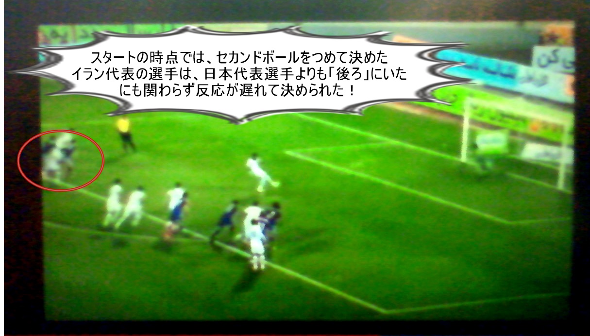 動画をスローで見てみると、セカンドボールを決めたイラン代表の選手は、PKが蹴られた瞬間のスタート時点では日本代表選手よりも「後ろ」に居ました。得点者のスタート自体は、むしろ日本代表選手よりも「遅かった」のです。
