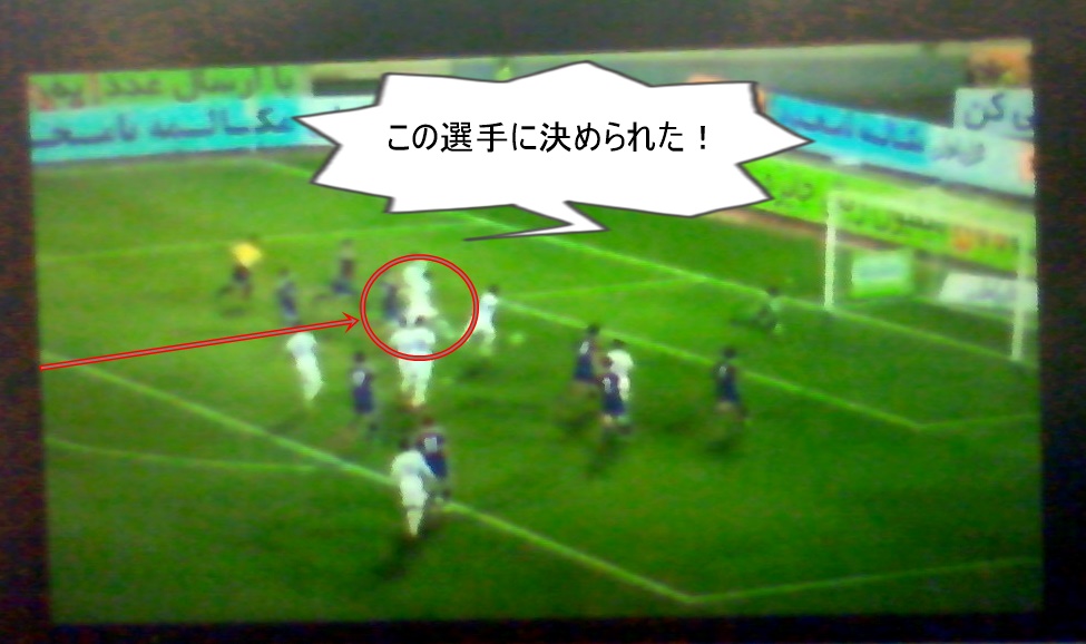 にも関わらず、日本代表選手はその後の対応が遅れて、後ろから来たこのイラン代表選手にセカンドボールを先に触られて決められてしまった。