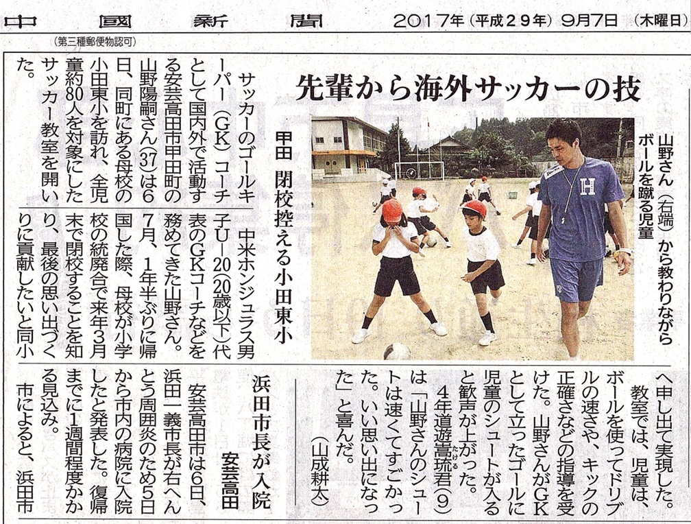 陽嗣-中国新聞記事(小田東小)2017.9.7-編集画像 投稿日: 2017年10月9日 @ 1008 × 764 | 創立「148年」の歴史に幕を下ろし「廃校」となる母校で「最後のサッカー教室」。 ← 前へ 次へ →