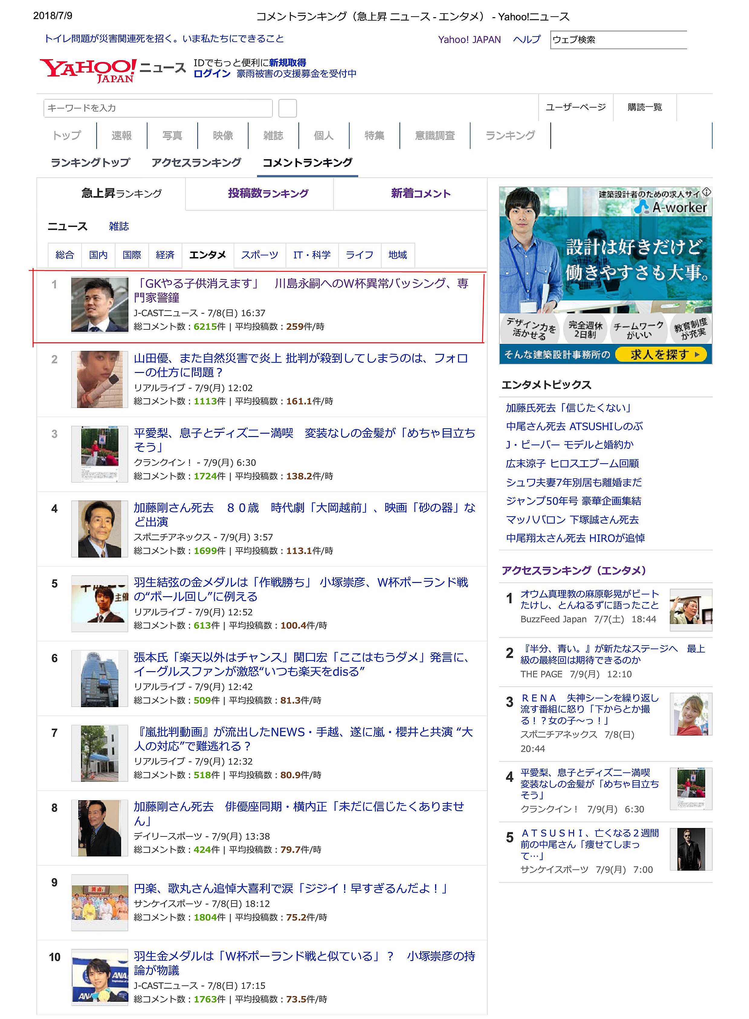 2018年7月9日(月)コメントランキング(急上昇 ニュース – エンタメ) – Yahoo!ニュース 投稿日: 2018年7月9日 @ 2479 × 3372 | 【日本代表】J-CASTニュースで掲載されたロシアW杯のGK川島永嗣選手の記事が、Yahoo!コメントランキングで「1位」になりました。 ← 前へ 次へ →