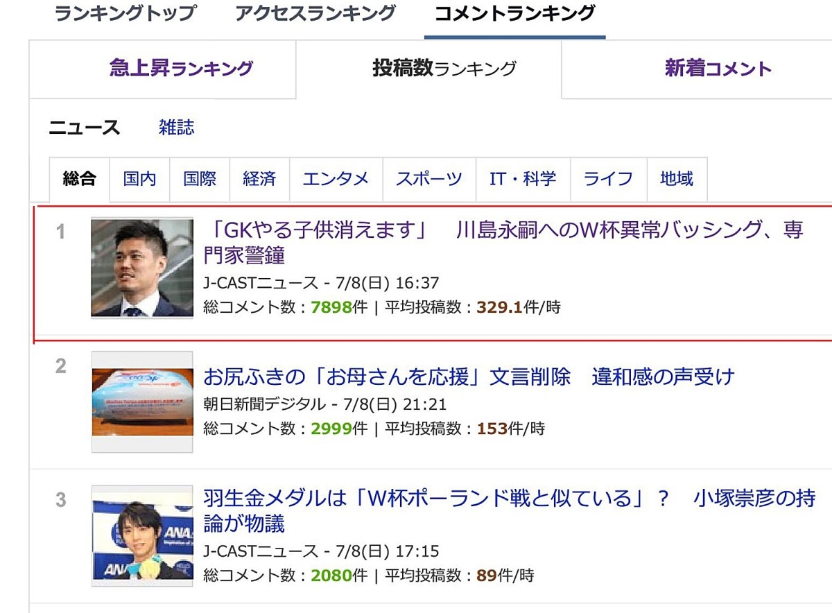 2018年7月9日(月)コメントランキング(投稿数 ニュース – 総合) 2- Yahoo!ニュース 投稿日: 2018年7月9日 @ 1535 × 1131 | 【日本代表】J-CASTニュースで掲載されたロシアW杯のGK川島永嗣選手の記事が、Yahoo!コメントランキングで「1位」になりました。 ← 前へ