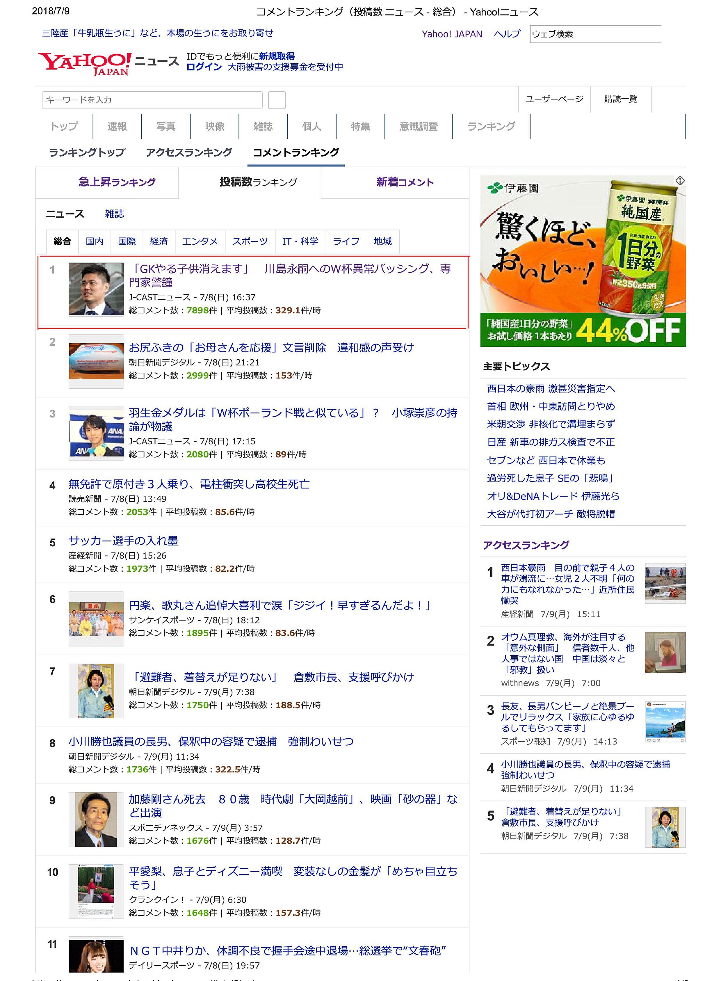 2018年7月9日(月)コメントランキング(投稿数 ニュース – 総合) – Yahoo!ニュース 投稿日: 2018年7月9日 @ 2479 × 3372 | 【日本代表】J-CASTニュースで掲載されたロシアW杯のGK川島永嗣選手の記事が、Yahoo!コメントランキングで「1位」になりました。 次へ →