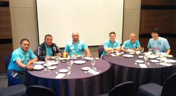※ホンジュラスA代表のコーチングスタッフ陣と、協会幹部と食事。毎日、毎食、このように同じ釜の飯を食べながら熱く語り、「良好な関係」と「強い絆」を築きました。