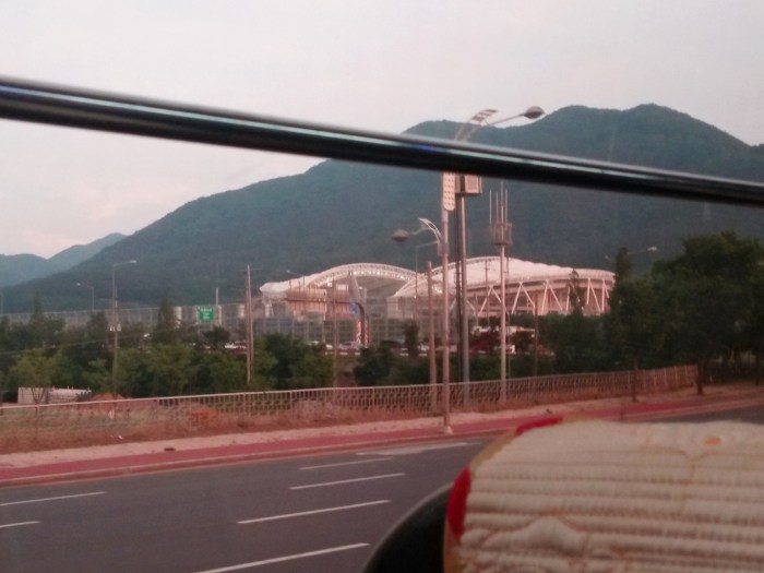 ※決戦の舞台、大邱スタジアムが見えてきました。U-20ホンジュラス代表(☜)もそうでしたが(たまにホンジュラスのクラブチームも)、試合でスタジアムが近付くと、バスの中で「代表の歌」をみんなで手を叩きながら歌い、士気を高めます。これも「文化」ですね。