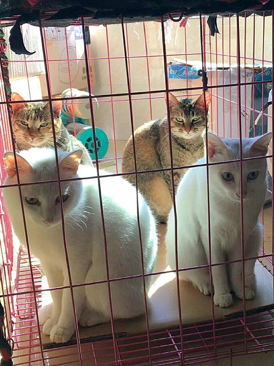 ジチマオ、メイメイと同じ母猫から生まれた兄弟猫の内の1匹が、同じ部屋のケージの中で息絶えました…(手前の白い猫2匹が、ジチマオ、メイメイの兄弟猫。その内の1匹が…。※後ろの2匹はジチマオとメイメイです)